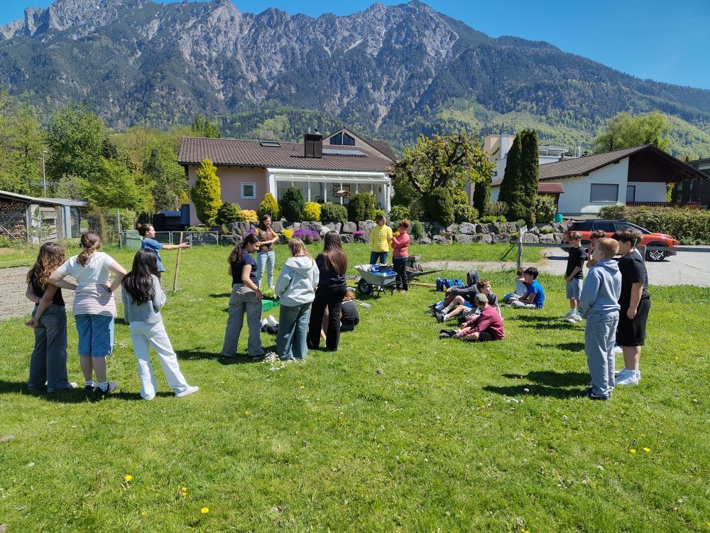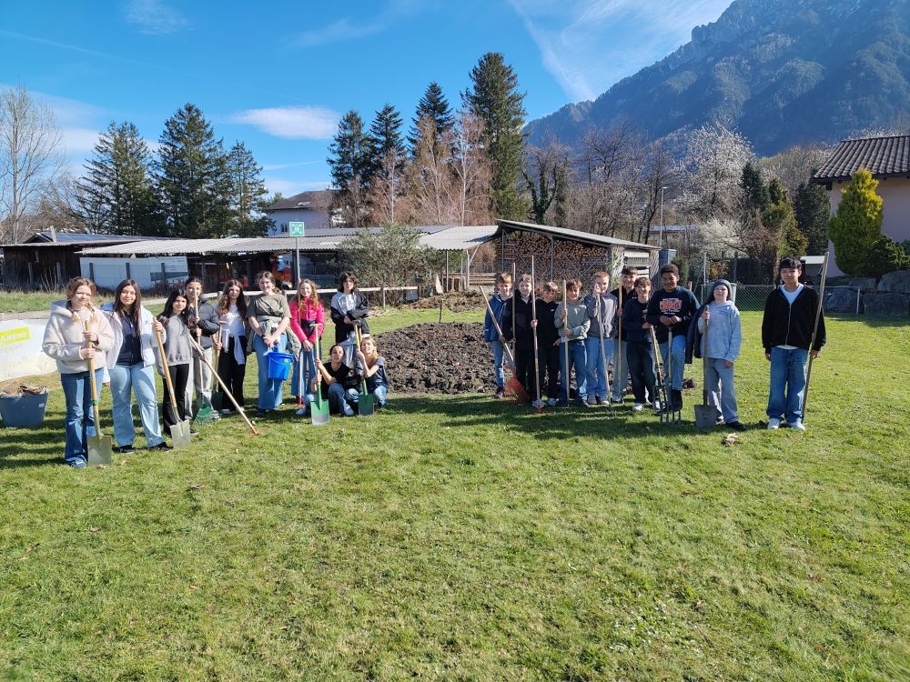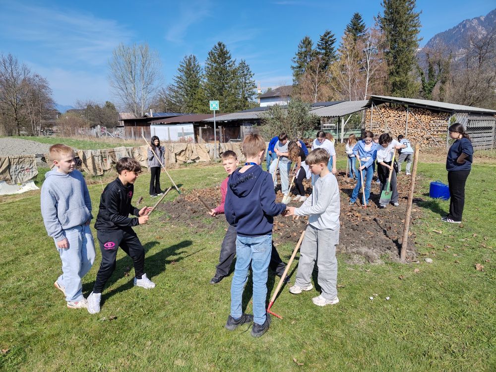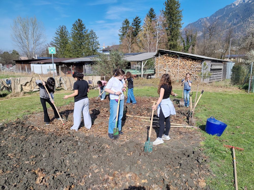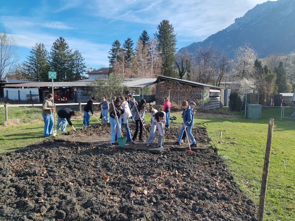 Die Klasse 1b hat am 24. und 25.3.2026 fleissig umgegraben. Der Acker darf nun bis nach den Frühlingsferien ruhen, damit die Mikroorganismen ihre Arbeit machen können. Bevor Ende April die erste Pflanzung erfolgt, werden noch Beete und Wege angelegt.
