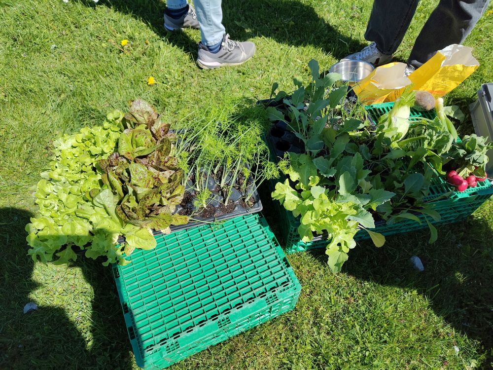 In der Zwischenzeit ist viel gewachsen. Die letzten Wochen waren wir fleissig und heute durften wir unsere erste grosse Ernte hereinholen: Salat, Radieschen und Kohlrabi. Die Schüler:innen durften alles, was sie wollten, mit nach Hause nehmen und ein paar Kohlrabi assen wir gleich an Ort und Stelle.